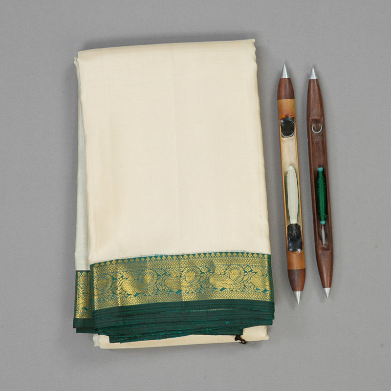 Hayagrivas Handloom Half-White Kanjivaram Silk Saree with Peacock Green Border KBE1795K2-1