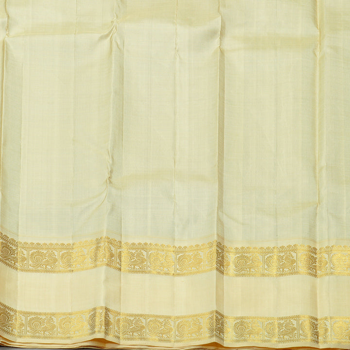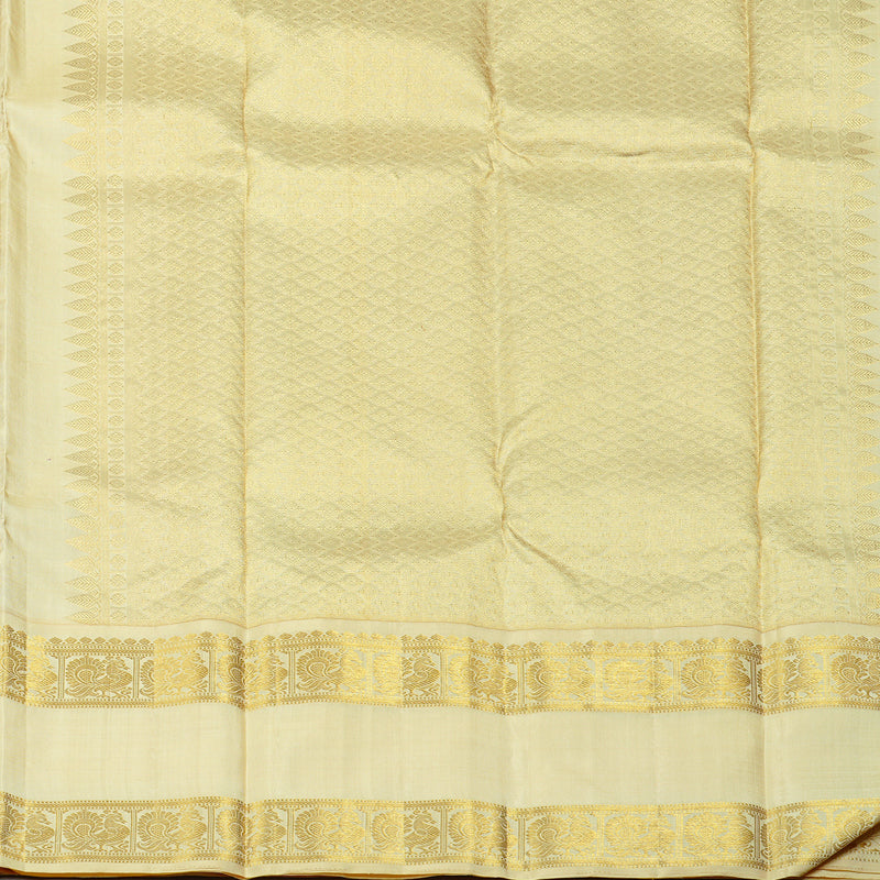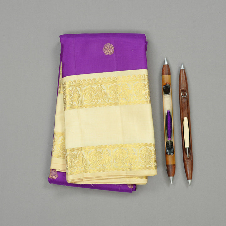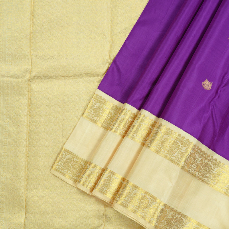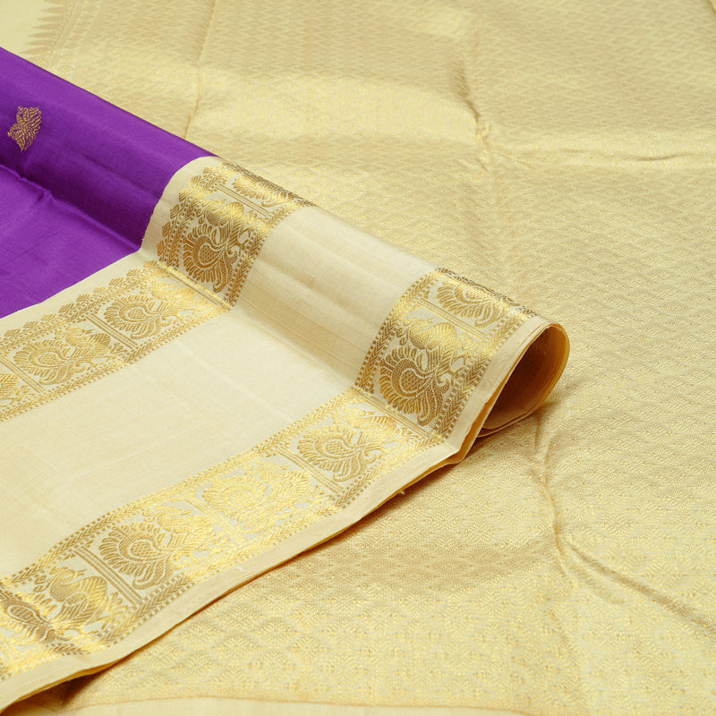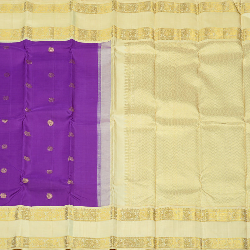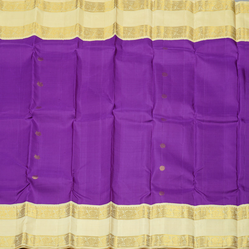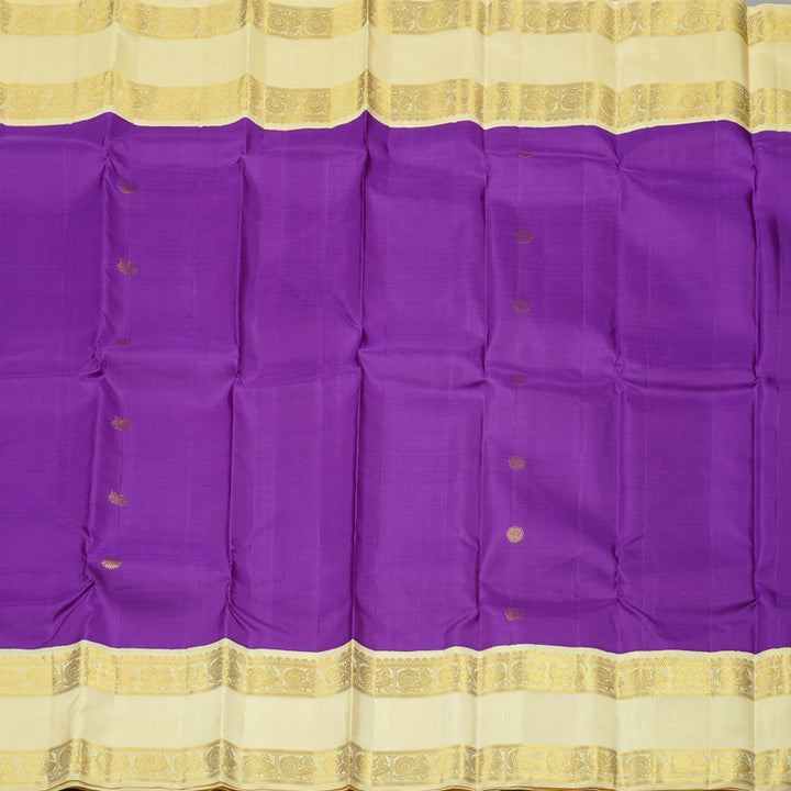 A vibrant purple Kanjivaram silk saree that's sure to stand out in any gathering, this beauty is paired with a graceful off white-coloured border and pallu. The rich contrast between the bold purple body and the subtle, golden-hued border adds a classy charm that's hard to miss.