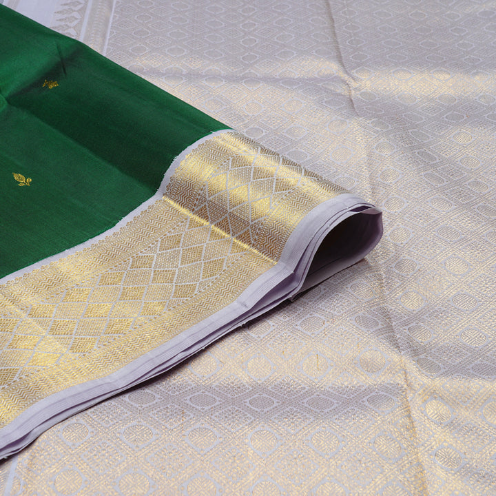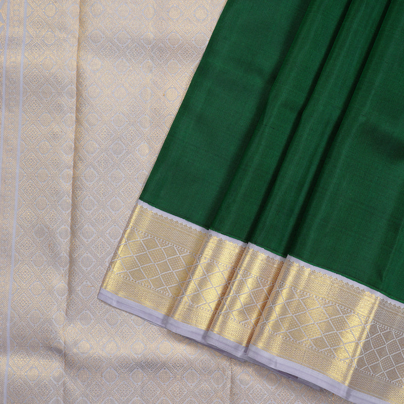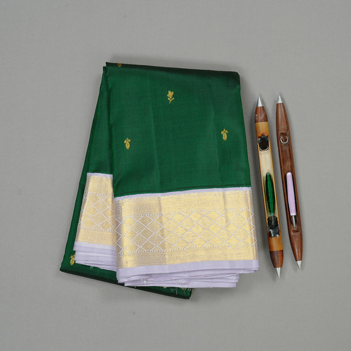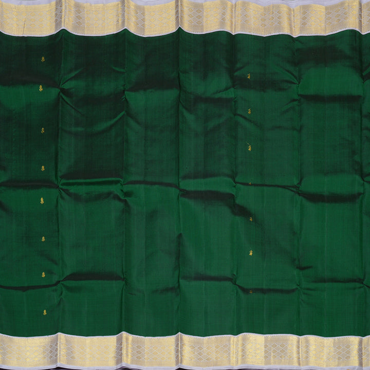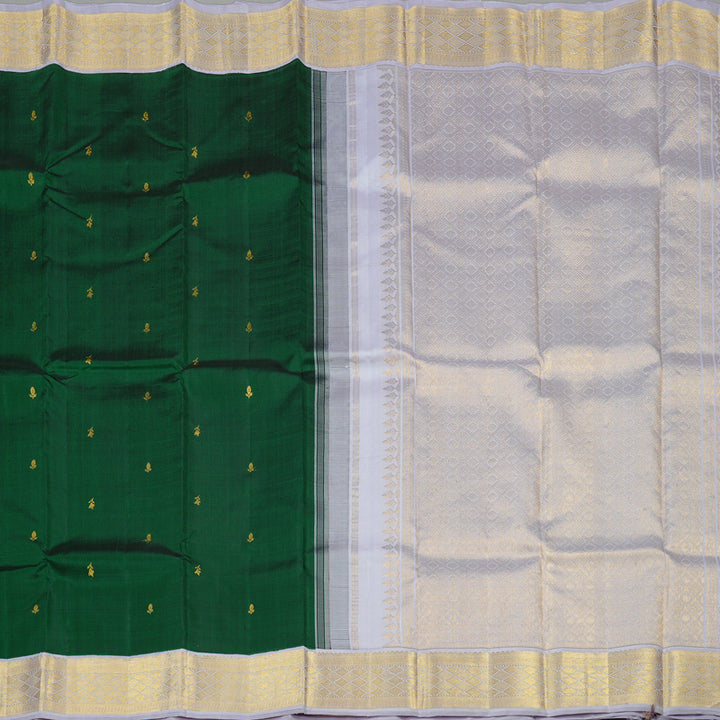 This bottle green Kanjivaram silk saree radiated opulence. The rich green tone is balanced with small zari buttas that don’t scream for attention but quietly impress. But what really turns heads is that silver-grey pallu and blouse, a stunning contrast with gold and silver detailing that catches light beautifully.