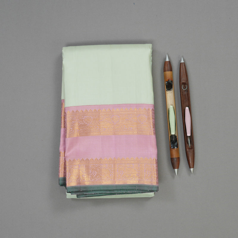 This charming Light Pista Green Korvai Contrast Kanjivaram Silk Saree is beautifully framed by a soft Baby Pink Border. The colour combination is fresh and subtle, perfect for a refined daytime look.