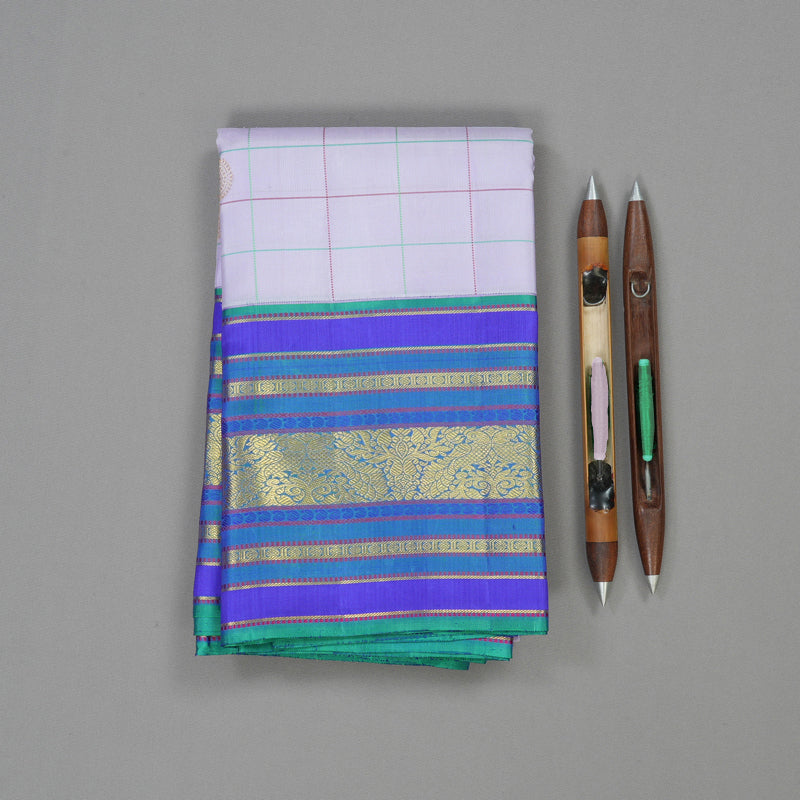 Embrace a soft, ethereal aesthetic with this lilac Handloom Kanjivaram silk saree, featuring subtle, muted thread checks across the body. This korvai contrast masterpiece is framed by a varisapet border, uniquely detailed with traditional motifs in blue thread work for a delicate, artisanal touch.