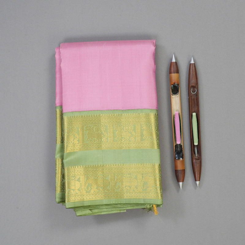 This enchanting Handloom Kanjivaram Silk saree features a radiant lotus pink body, hand-woven with the classic korvai contrast technique for a flawless, artisanal finish. It is framed by a traditional rettapet border detailed with heritage elements, offering a structured and timeless appeal.