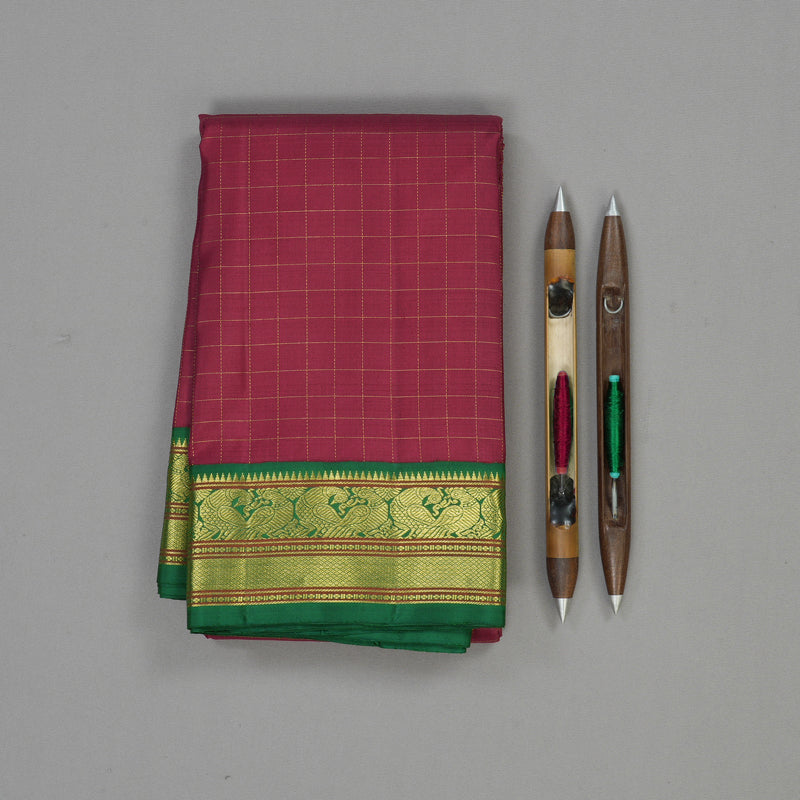 Capture the essence of traditional grandeur with this Handloom Kanjivaram Silk Saree, featuring a deep Maroon body intricately detailed with shimmering jari checks. This classic pattern is beautifully framed by a border adorned with peacock motifs, symbolizing beauty and heritage in every thread.