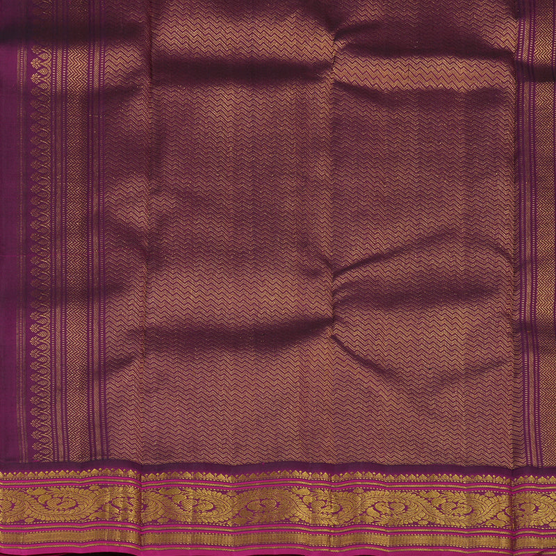 The drape is framed by an intricate woven border featuring timeless traditional motifs, lending it a majestic and heritage-rich appeal. Completed with a striking purple rich-woven pallu and matching blouse, this masterfully crafted ensemble offers a bold and auspicious colour palette, priced at Rs. 22,840.