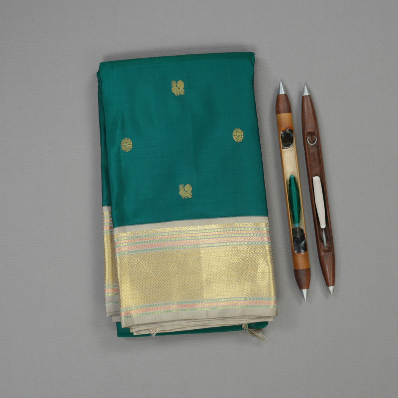 This unique masterpiece of a Handloom Kanjivaram silk saree features a majestic peacock green body, intricately woven with traditional annam and chakaram motifs. Crafted with the heritage korvai contrast technique, it is framed by a bold and solid gettipet border, adding a layer of regal structure to the drape.