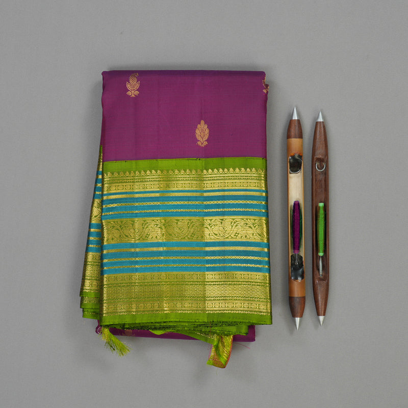 Step into the regal contrast of this Purple Vintage Kanjivaram Silk Saree, framed by a contrast Olive green border. The Varisapet border is richly woven with a complex blend of elephant, Annapakshi, and paisley motifs and all over the butta on the body, turning the edge into a magnificent tapestry of traditional art.