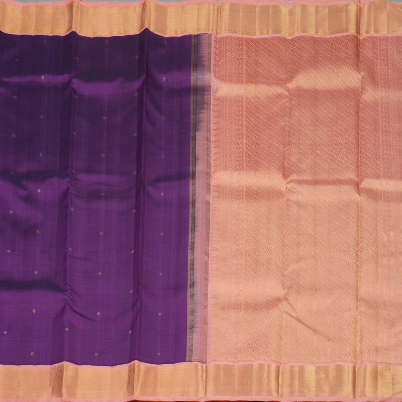 Radiate elegance in this purple Handloom Kanjivaram silk saree, featuring delicate small butta motifs scattered across the body. Crafted with the traditional korvai contrast technique, it features a lustrous gettipet border that adds a solid, regal frame to the drape.