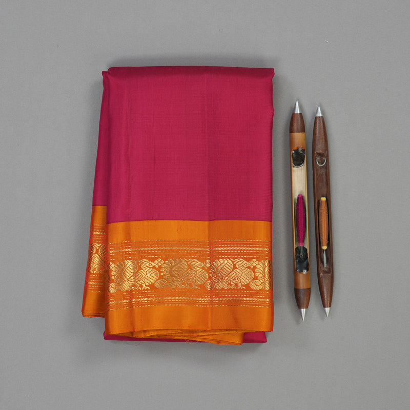 This Handloom Kanjivaram features a radiant reddish-pink body, offering a vibrant and feminine glow. The premium silk is masterfully woven to ensure a majestic and fluid drape, making it a timeless choice for those who appreciate a rich, classic palette with a modern sheen.