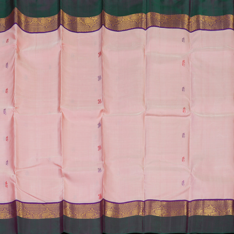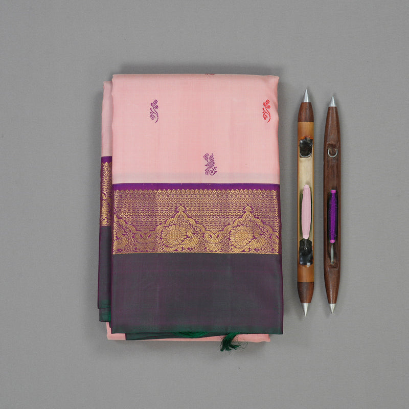 This Handloom Kanjivaram features a radiant rose pink body adorned with delicate thread buttas, offering a soft and luminous charm. The masterfully woven silk ensures a fluid, graceful drape, blending traditional craftsmanship with a contemporary and romantic aesthetic.