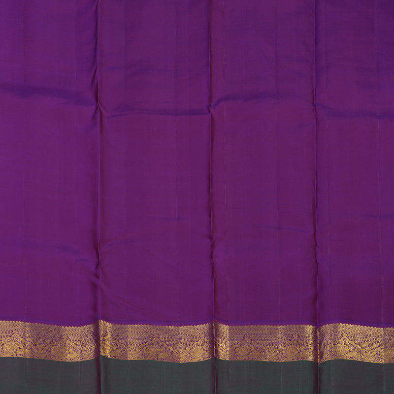 The saree is elegantly framed by a heritage "Kaal erangina" border (also known as Hanging border) featuring intricate peacock motifs, adding a touch of architectural grandeur. Completed with a luxurious purple rich-woven pallu and matching blouse, this vibrant and regal masterpiece is priced at Rs. 20,650.