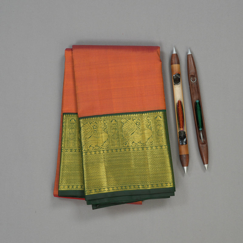 An earthy, classic contrast defines this traditional Rust Orange Korvai Contrast Kanjivaram Silk Saree, framed by a deep Bottle Green Border. This pure silk features peacock motifs on the border.