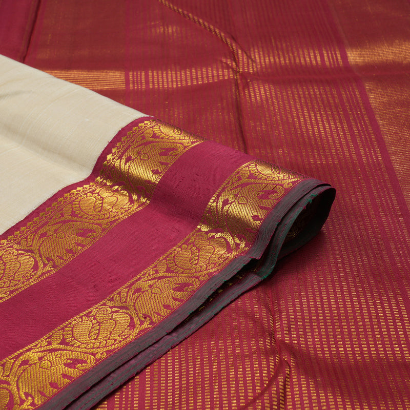 This Handloom Kanjivaram features a refined sandal beige body, offering a neutral canvas of understated luxury. Meticulously crafted with korvai weaving, it showcases a grand rettapet border detailed with peacock and elephant motifs, accented by a vibrant manthalir selvedge.