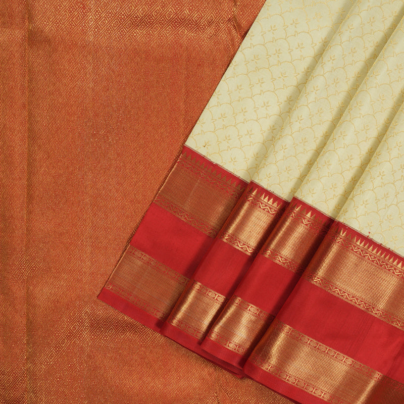 This stunning pure silk saree in warm sandal features luxurious brocade work across the body, exuding timeless opulence. The rettapet border with korvai contrast creates visual sophistication and contemporary edge, while the richly woven pallu transitions to a bold red, establishing a striking chromatic statement.