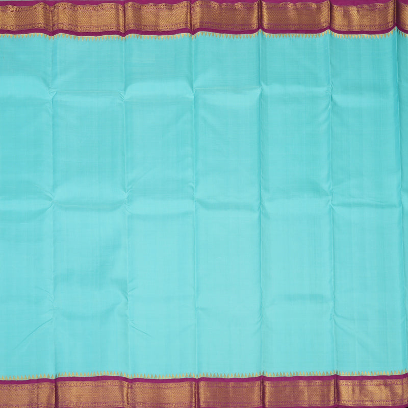 Captivate every gaze with this ethereal sky blue Handloom Kanjivaram silk saree. This masterpiece features a traditional purple korvai contrast, where the serene blue body is flawlessly joined to a deep purple border. The border is further distinguished by the iconic temple rekku, lending a touch of sacred geometry and heritage to the design.
