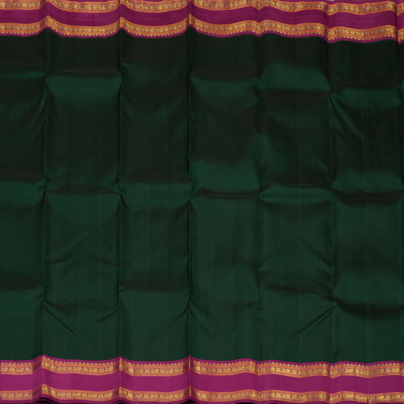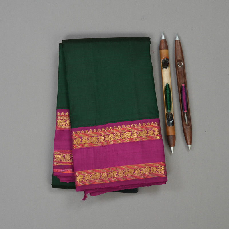 Experience timeless grace in this karum pachai (dark green) Handloom Kanjivaram silk saree, meticulously crafted using the traditional korvai contrast technique. The saree features a classic rettapet border intricately detailed with elegant paisley and peacock motifs, symbolising fertility and prosperity.