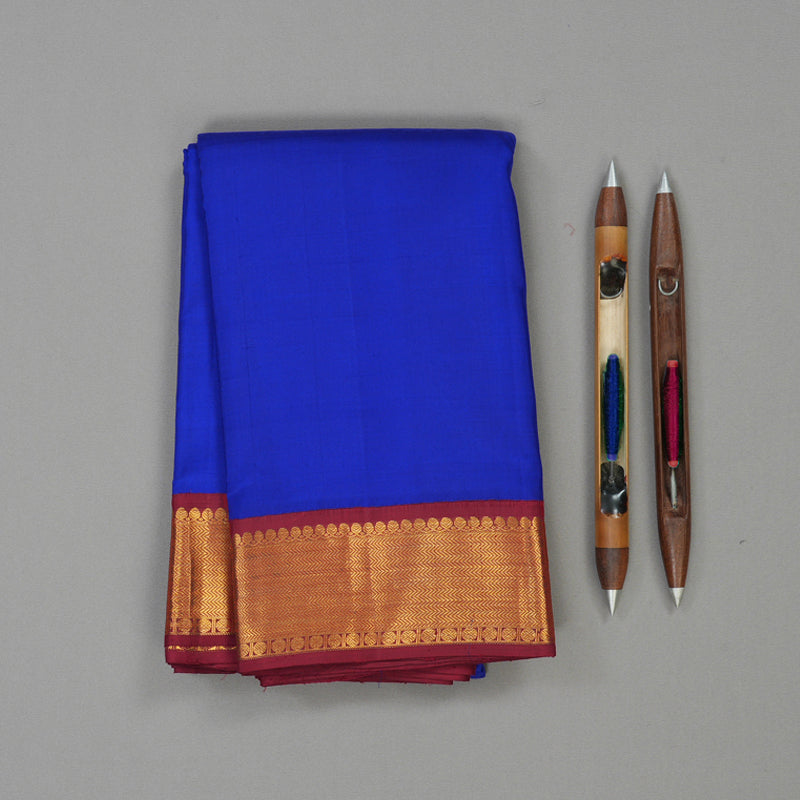 Embrace a timeless aesthetic with this MS Blue Handloom Kanjivaram silk saree, expertly crafted using the traditional korvai contrast technique. The body is framed by a majestic maroon gettipet border, offering a structured and opulent look that stays true to heritage weaving traditions.