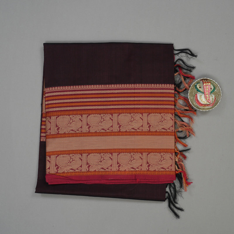 This sophisticated Pure Kanchi Silk Cotton Saree features a deep burgundy body paired elegantly with a traditional Variapet border, distinguished by intricate motifs and refined thread work.