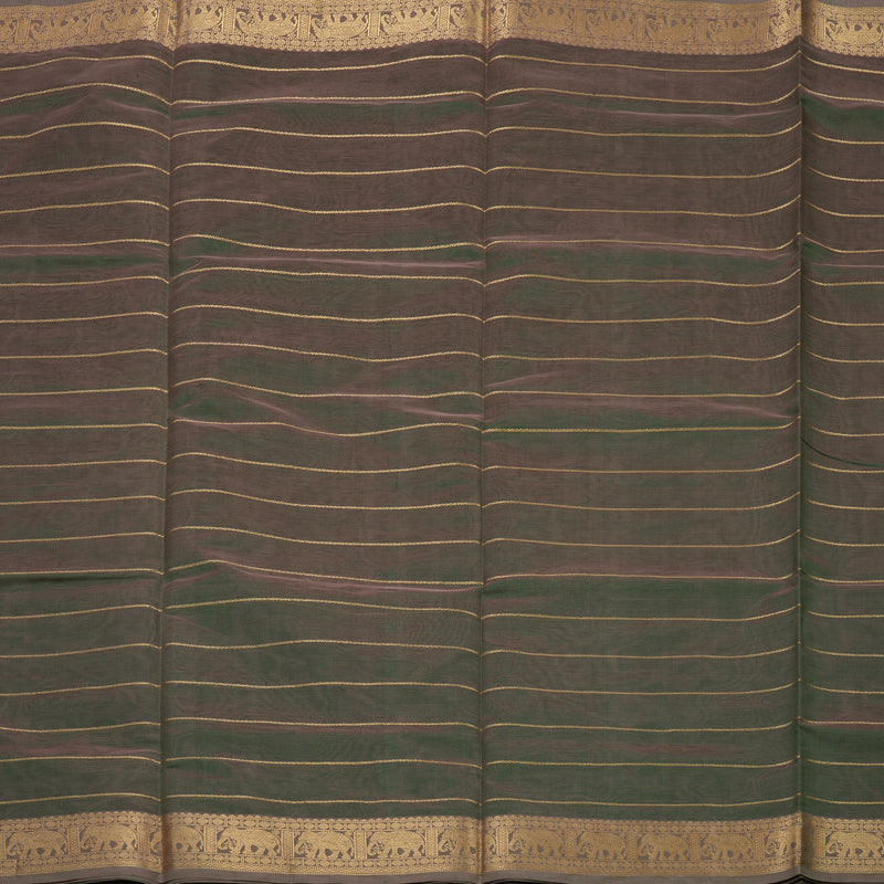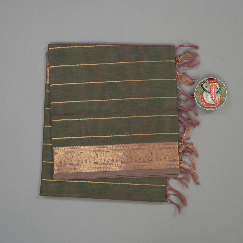 This exquisite Pure Kanchi Silk Cotton Saree features a captivating rosewood and green dual-tone body, elegantly detailed with traditional veldhari jari lines. The design is framed by a distinguished border adorned with elephant and rudraksham motifs, leading to a richly woven pallu that exemplifies superior craftsmanship.