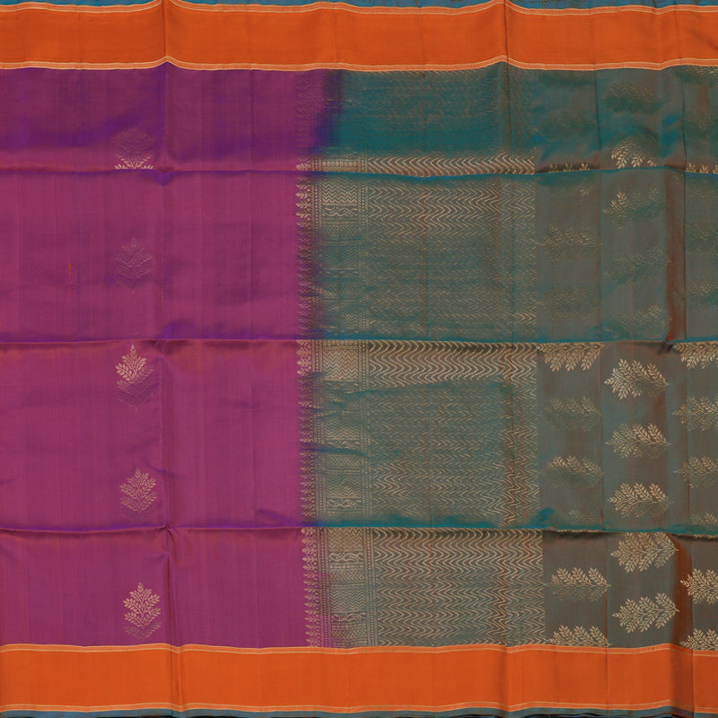 This captivating Pure Soft Silk Saree features an attractive dual-toned purple body that radiates a luxurious sheen. The design is traditionally anchored by a vibrant orange rettapet border and transitions into a unique, dual-tone deep teal and rust pallu and blouse.