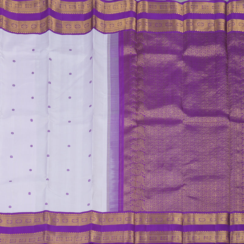 Discover timeless elegance with this exquisite Hayagrivas Handloom Lilac Kanjivaram Silk Saree. The soft lilac body features delicate thread buttas that add subtle sophistication, while the striking korvai contrast creates visual depth. The Rettapet border showcases traditional woven elements that celebrate authentic craftsmanship. A rich, intricately woven pallu in complementary purple elevates the entire drape.