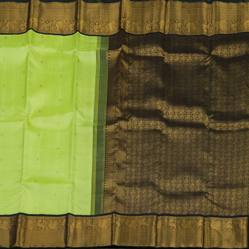 Make a bold statement in this bright lime green Handloom Kanjivaram, featuring an eye-catching colour combination that balances vibrant energy with classic poise. Handcrafted using the traditional korvai contrast technique, the luminous body is perfectly joined to a striking black frame.