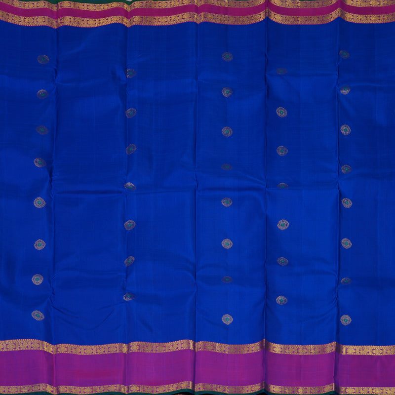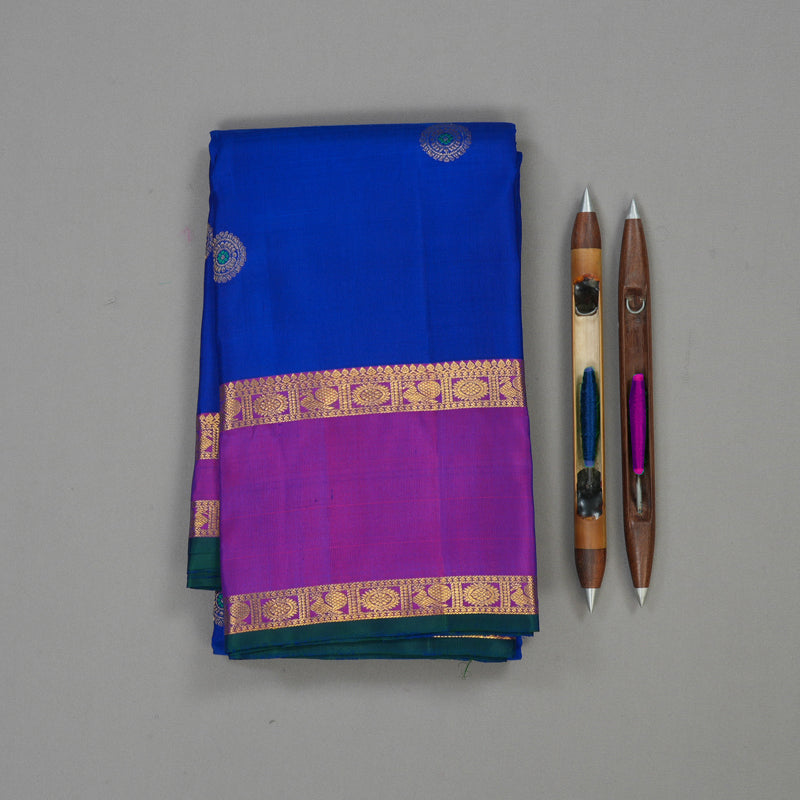 Exude regal charm in this MS Blue Handloom Kanjivaram silk saree, featuring a body adorned with chakaram motifs meticulously rendered in intricate jari and thread work. The saree is framed by a sophisticated morning-evening border in a rettapet style, further enriched with annam and chakaram motifs and a vibrant mayilkazhuthu selvedge.