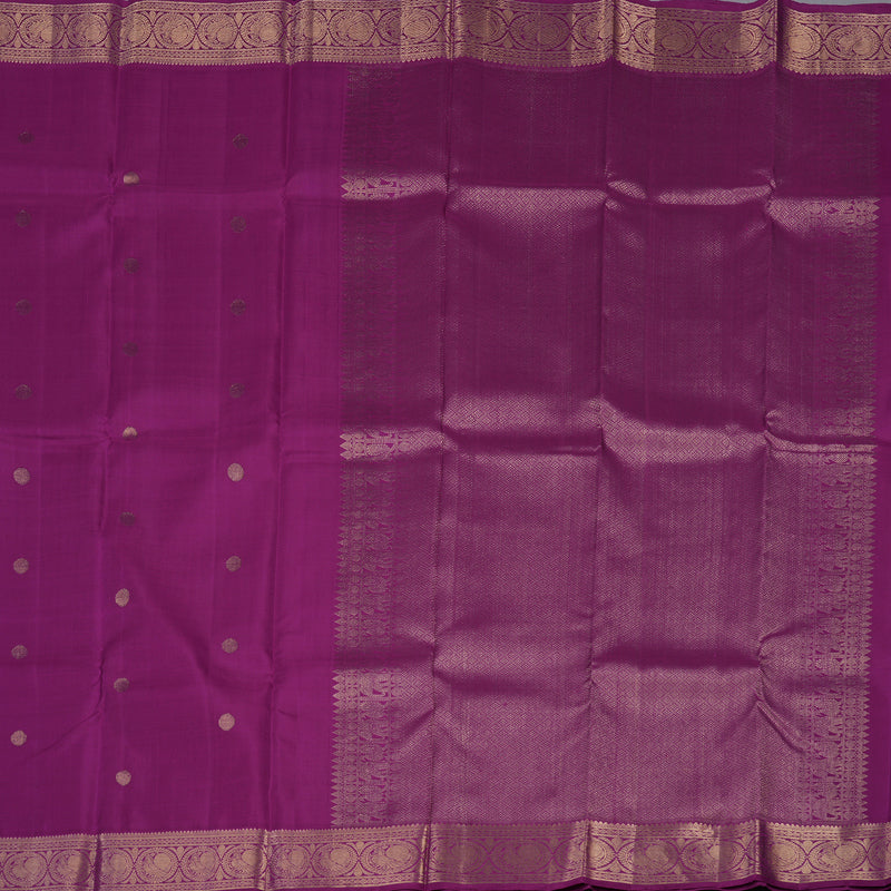 Embrace sophisticated luxury in this purple monotoned Handloom Kanjivaram silk saree, featuring traditional rudraksham motifs across the body. The hallmark of this piece is its subtle, polished jari look, offering a refined lustre rather than a shimmering finish—a unique feature that adds to its understated elegance.