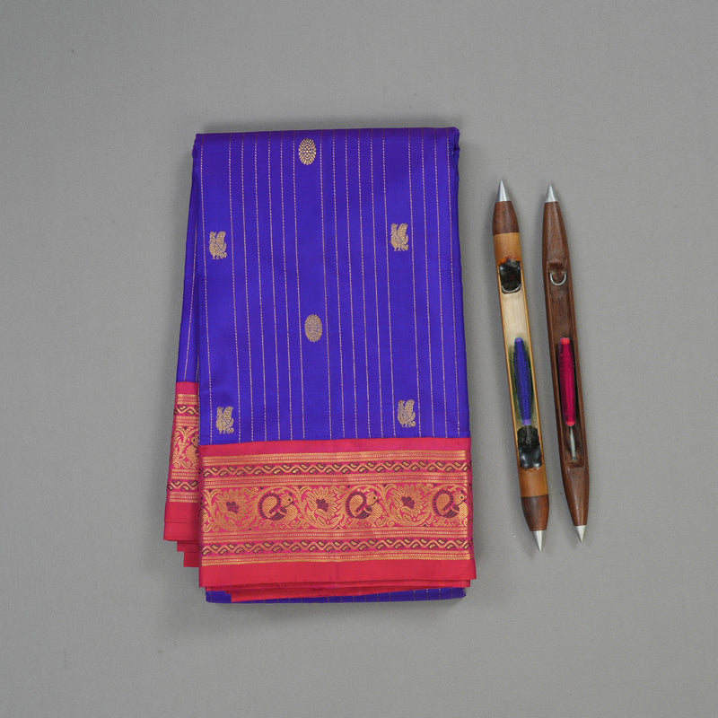 Discover the exquisite beauty of our Handwoven Purplish Blue Kanjivaram Silk Saree, adorned with a vibrant pink contrast border, blouse, and pallu. The saree features delicate vertical zari lines with annam and chakaram motifs on the body, along with stunning annapakshi and floral motifs on the border that enhance its charm.
