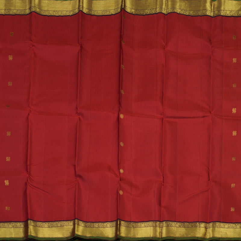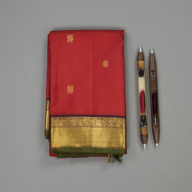 Embrace the essence of heritage in this very traditional red Handloom Kanjivaram silk saree, featuring classic annam and chakaram motifs woven across the body. This quintessential piece is anchored by a regal gettipet border and finished with a delicate manthalir selvedge, adding a subtle touch of contrasting grace.