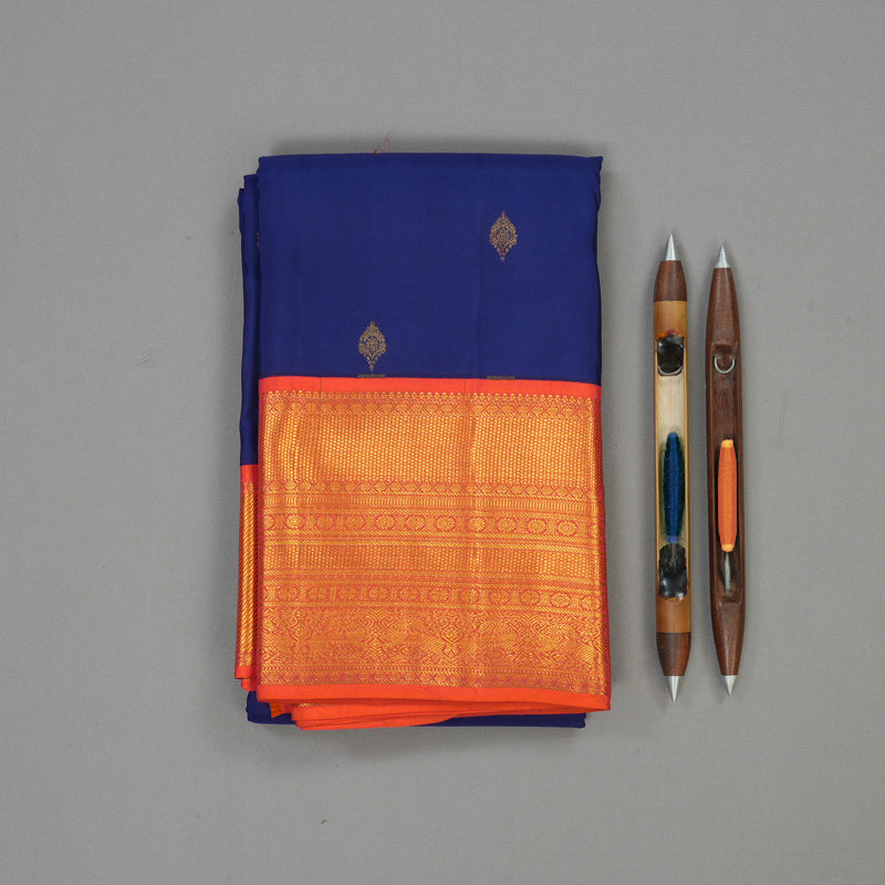 Make a stunning impression in this royal blue Handloom Kanjivaram silk saree, featuring delicate floral-inspired buttas woven across the body. The drape is anchored by a traditional evening-morning where one with a grand look and the other with gettipet border, providing a regal and structured finish that highlights the saree's premium craftsmanship.