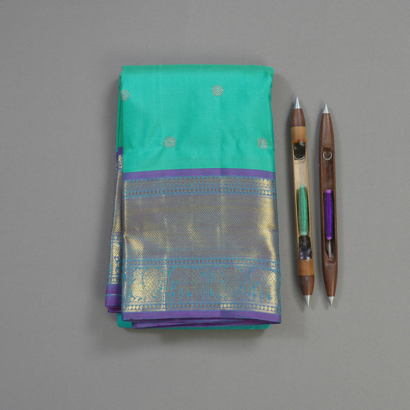 Experience the timeless elegance of our handloom Kanjivaram silk saree, beautifully crafted in a mesmerizing teal embellished with a rich purple contrast. The saree features delicate butta motifs that gracefully adorn the body, while the exquisite border showcases traditional elephant and annapakshi motifs, symbolizing prosperity and strength.