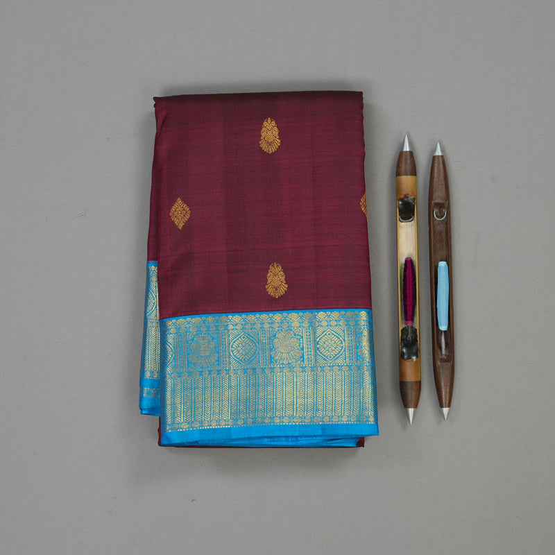 Embrace bridal opulence in this wine-colored Handloom Kanjivaram silk saree, featuring a body intricately adorned with iruthalaipakshi and floral motifs. Crafted with the traditional korvai contrast technique, it boasts a grand woven border showcasing a majestic array of elements, including iruthalaipakshi and rudraksham motifs.