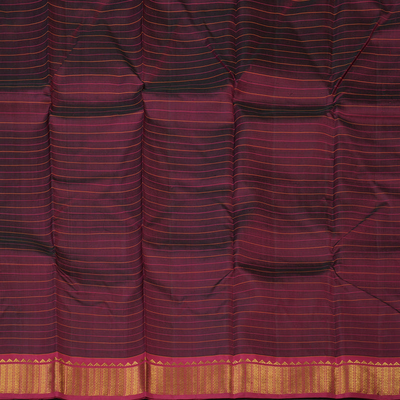 This regal Handloom Kanjivaram Silk saree features a deep wine body adorned with traditional veldhari thread lines, which lend a refined texture and rhythmic lustre to the drape. The deep, wine-toned silk is elegantly paired with a maroon-rich pallu and matching blouse, creating a sophisticated, tonal harmony that radiates royal grace.