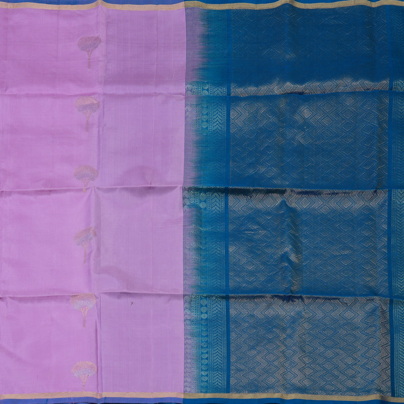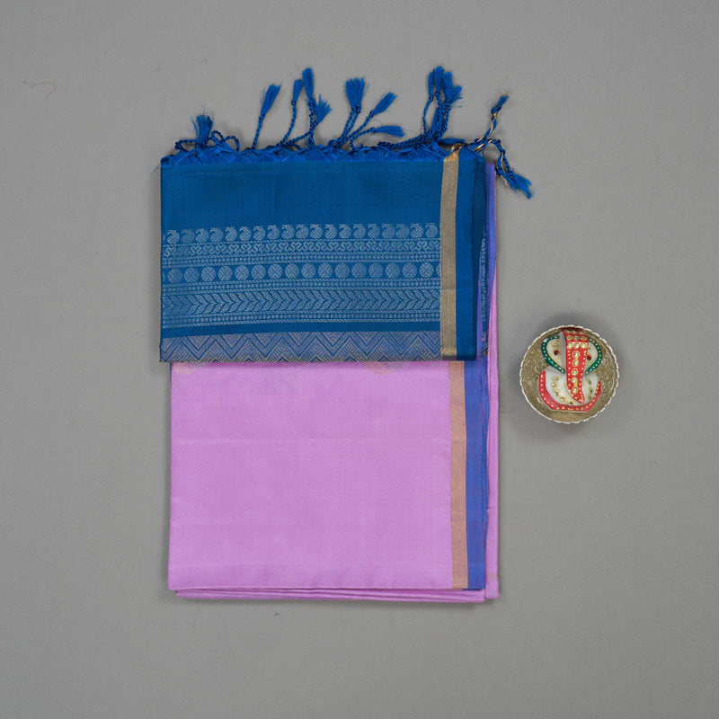 This elegant Pure Soft Silk Saree features a graceful lavender body delicately adorned with shimmering butta motifs. The design is refined by a sophisticated one-inch contrast border that leads into a striking peacock blue pallu and blouse, offering a vibrant and modern color story.