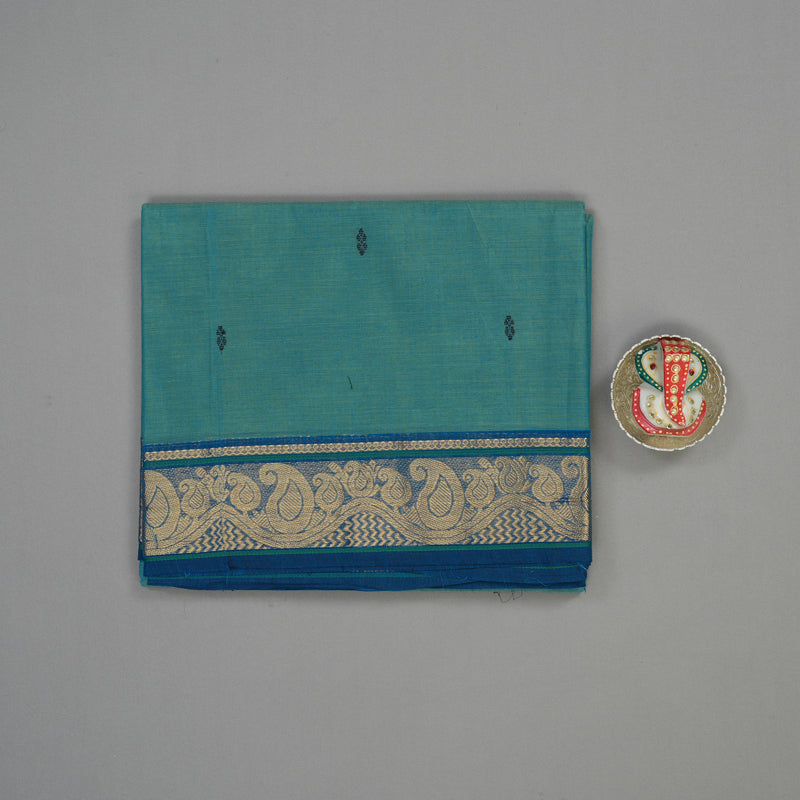 Embrace comfort with this beautiful cotton saree in light blue, featuring a striking dark blue border adorned with elegant Paisley motifs. Easy to carry and perfect for all-day wear, it’s available for just Rs. 1,300.