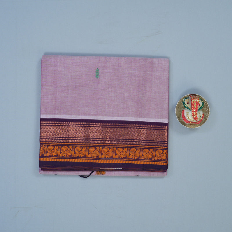 Delicate pastel lilac Chettinad cotton saree with a refined violet traditional woven border. Breathable cotton construction ensures comfortable, hassle-free draping for all-day elegance. Subtle sophistication and comfort, priced at Rs. 1300.