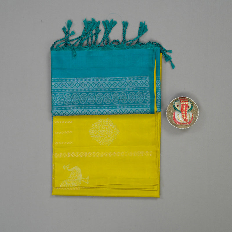 This vibrant Pure Soft Silk Saree features a radiant lime yellow body in a sophisticated borderless design, offering a sleek and modern silhouette. The ensemble is beautifully elevated by a contrasting blue-green pallu and blouse, creating a striking and luxurious color palette.