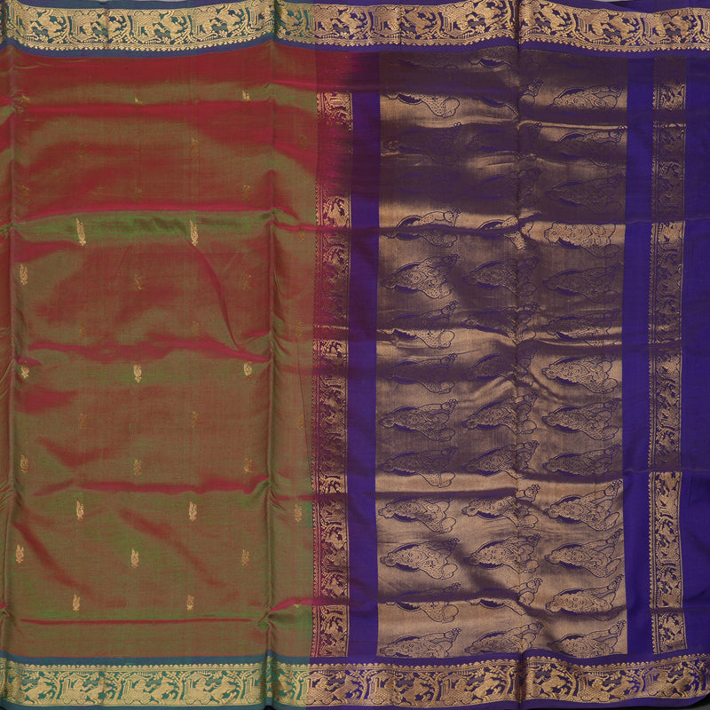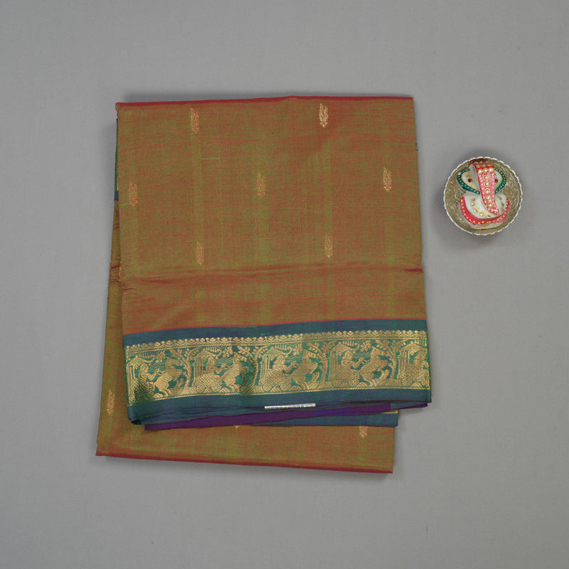 This exquisite Pure Kanchi Silk Cotton Saree features a body in a perfect shade of Manthalir, beautifully contrasted by a blue border featuring a detailed king and horse travelling motif. The artistry continues with a magnificent Krishna detailed pallu in a vibrant violet, which also extends to the matching blouse.