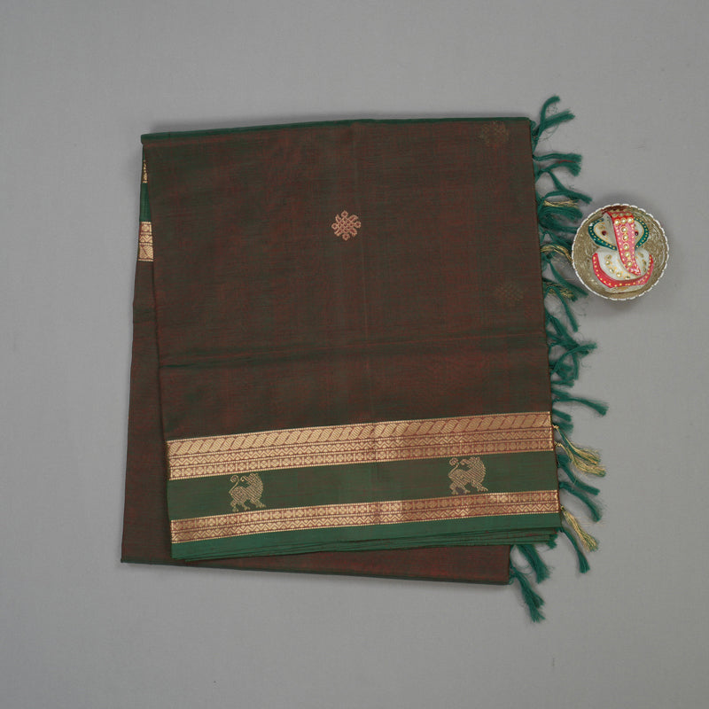 This striking Pure Kanchi Silk Cotton Saree in a vibrant Manthalir hue features a body beautifully adorned with traditional kolam butta. The design is elevated by a sophisticated rettapet border detailed with majestic Yazli motifs, transitioning into a richly woven pallu that reflects timeless artistry.
