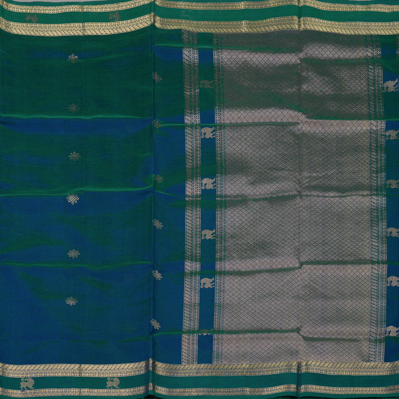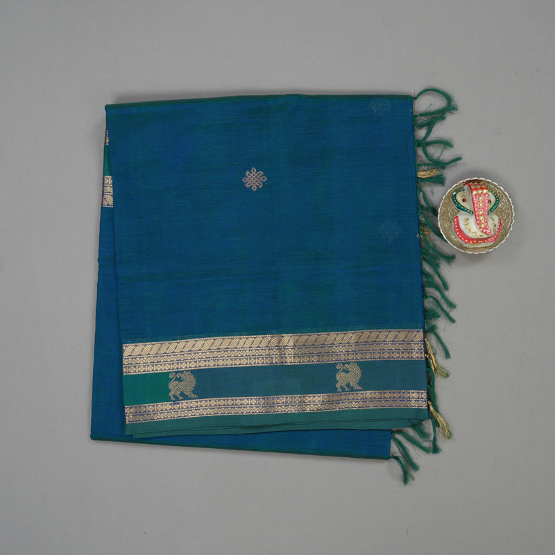 This striking Pure Kanchi Silk Cotton Saree in a vibrant Mayilkazhuthu hue features a body beautifully adorned with traditional kolam butta. The design is elevated by a sophisticated rettapet border detailed with majestic Yazli motifs, transitioning into a richly woven pallu that reflects timeless artistry.