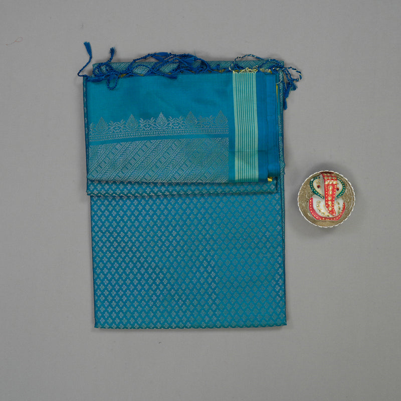 This opulent Pure Soft Silk Saree features a majestic peacock green body fully enriched with intricate jari brocade work. The design is balanced by a simple border and a richly woven pallu, creating a look of refined grandeur.