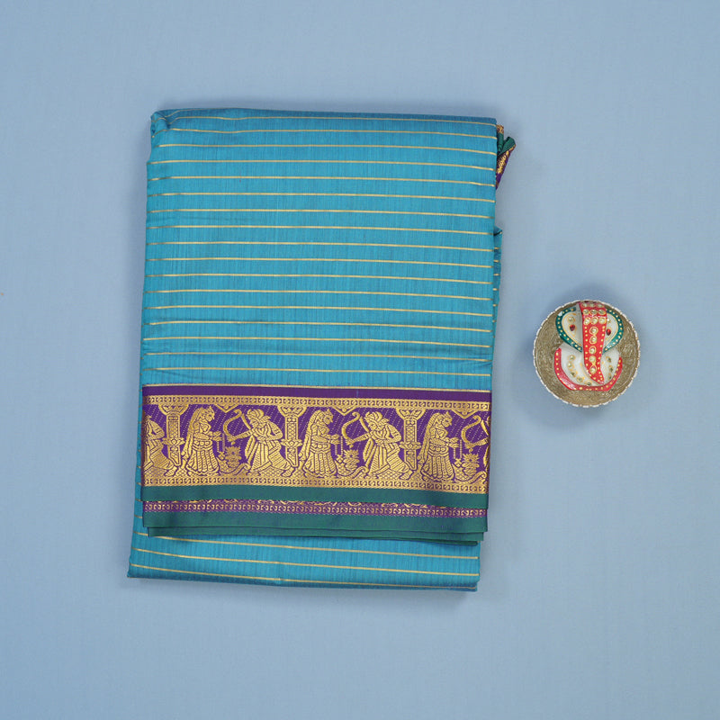 This ethereal ten yards semi silk saree features a serene powder blue body with veldhari lines and an exquisite "Ramayanam" detailed border. The artistic weave flows into a regal purple border and pallu, creating a storytelling masterpiece that balances heritage and elegance for Rs. 3,060.