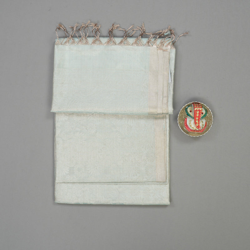 This ethereal Pure Tissue Soft Silk Saree features a delicate powder blue hue, beautifully transformed into a monotoned masterpiece. The entire drape is enriched with intricate brocade tissue work, offering a luminous sheen and a luxurious texture that radiates sophistication.