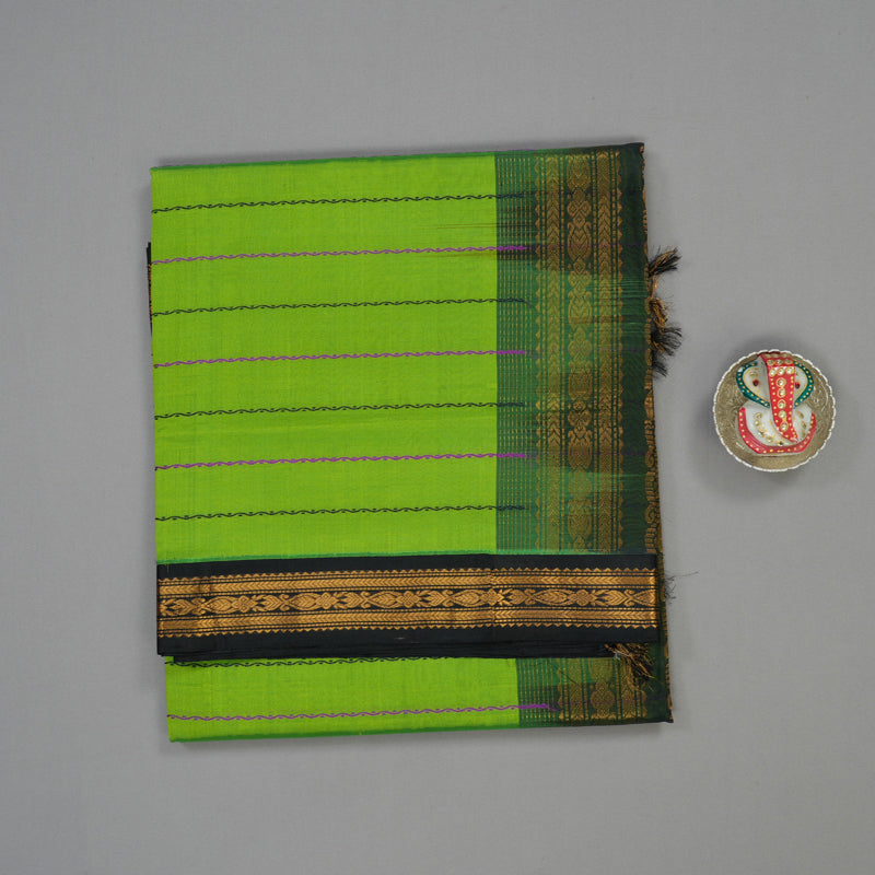 This exquisite parrot green silk-cotton saree showcases sophisticated black contrast thread work veldhari lines meticulously woven across the body, creating an elegant geometric pattern. The understated minimal border in contrasting tones adds refined detail without compromising the saree's graceful aesthetic.