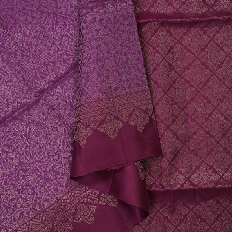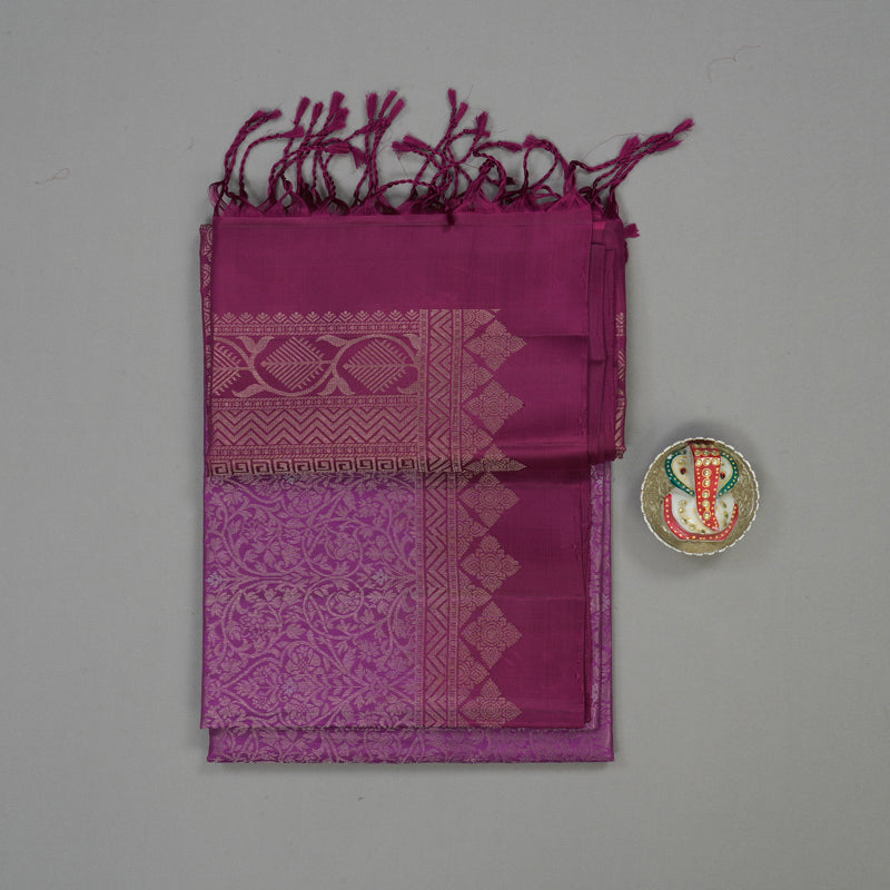 This luxurious Pure Soft Silk Saree features a regal purple body fully embellished with intricate brocade jari work. The design is elevated by a richly woven pallu in a deep wine shade, perfectly complemented by a matching wine blouse.