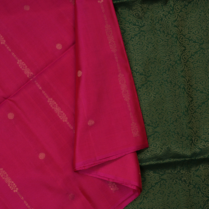 This stunning Pure Soft Silk Saree features a vibrant rani pink body in a modern borderless design, offering a sleek and contemporary silhouette. The look is beautifully anchored by a contrasting bottle green pallu and blouse, creating a rich look that is both bold and sophisticated.