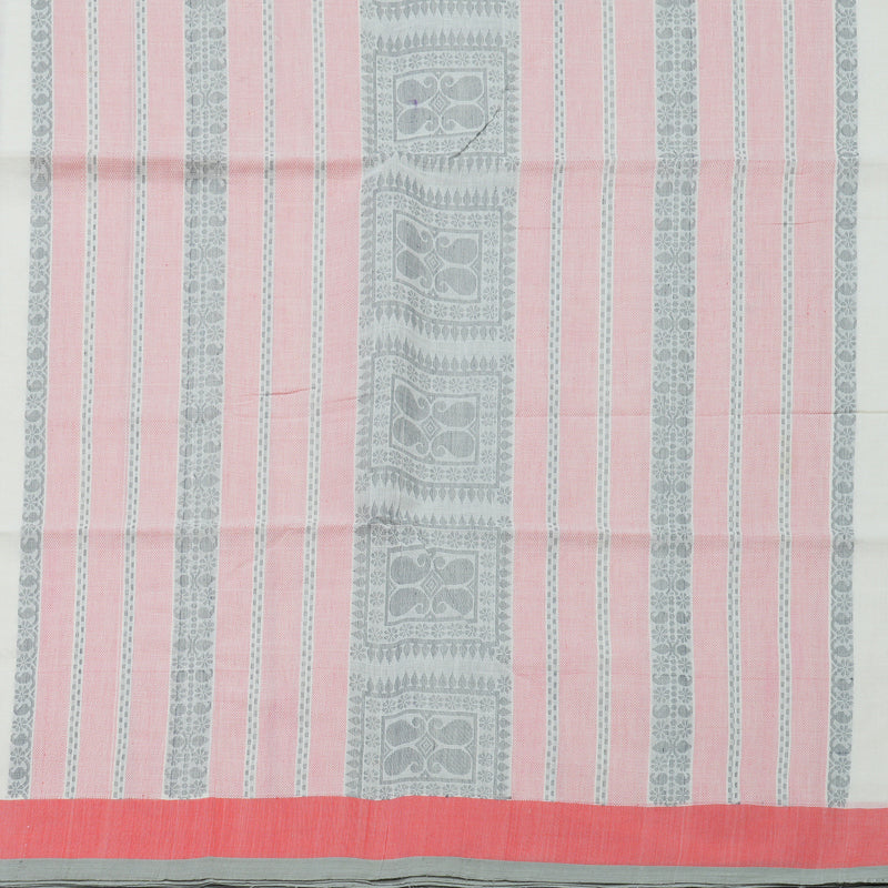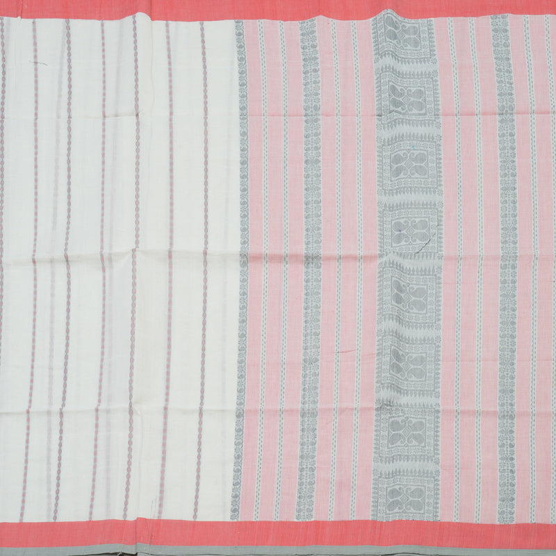 This classic handloom traditional kanchi cotton saree features a pristine white body framed by a vibrant reddish-pink border with grey edging. Complete with a thread work pallu and a crisp white blouse, it offers a timeless and sophisticated look for Rs. 3970.