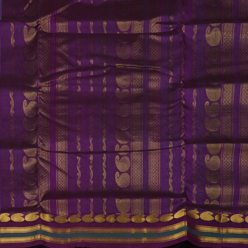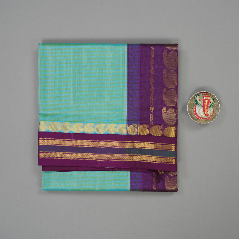 This stunning, bright teal Pure Ten Yards Silk Cotton saree features a traditional paisley motif border, adding a layer of intricate heritage to the vibrant body. Designed specifically for temple wear, this graceful ten-yard drape is beautifully elevated by a rich violet pallu and blouse, offering a striking and regal colour combination that exudes elegance for Rs. 10080.