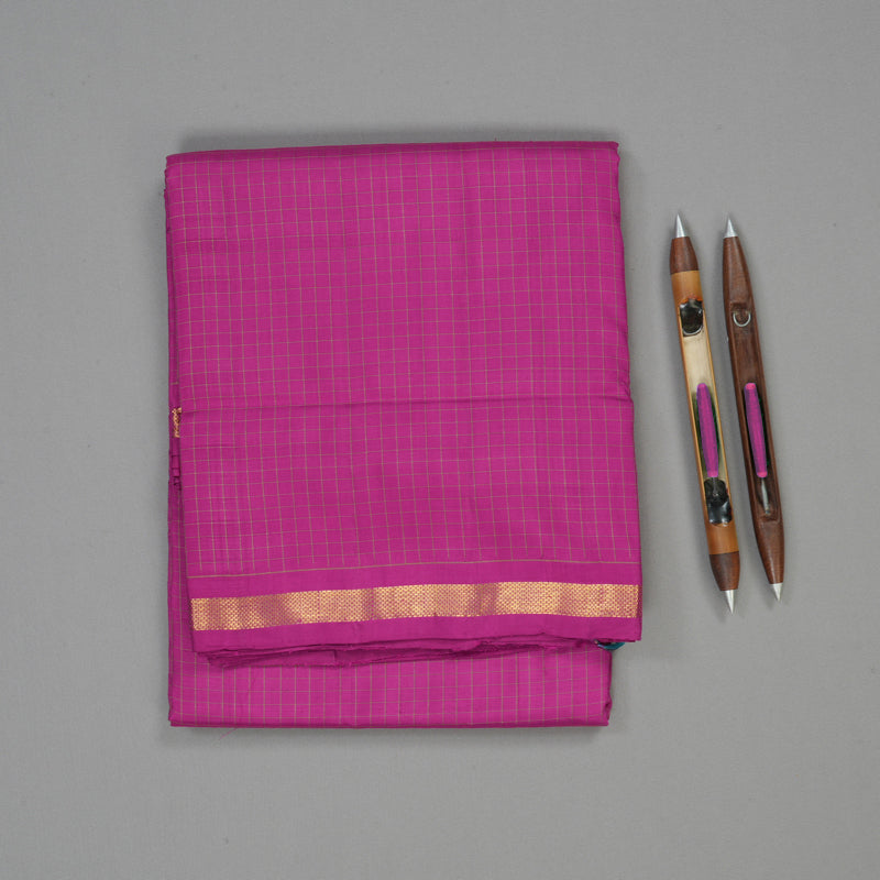 Vibrant Kanjivaram silk madisar in striking magenta, featuring delicate thread checks woven across the body for subtle texture and movement. The refined one-inch border maintains traditional proportions with understated elegance, while the matching pallu creates a cohesive and coordinated look.