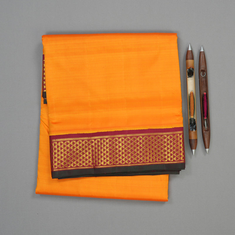A vibrant, classic contrast defines this festive Mango Orange Kanjivaram Ten Yards Silk Saree, framed by a deep Maroon Border. This 9-yard silk features the structural arai madam border, ensuring an elegant and classic traditional drape.